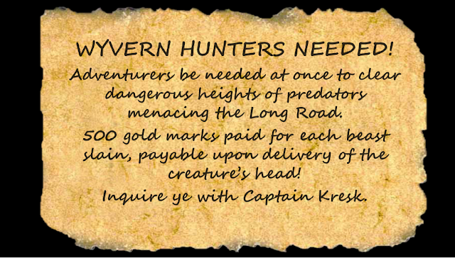 Caravan protection complete, our adventurers head east toward the wyvern cliffs.  After leaving the caravan, we run into Glorian- a boisterous antagonist from our past.  He is accompanied by another man and a cart full of wyvern heads.  Day two rolls on into high sun when our adventurers spot their first wyvern in the sky.